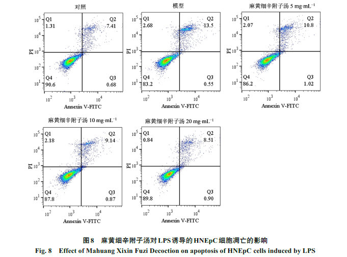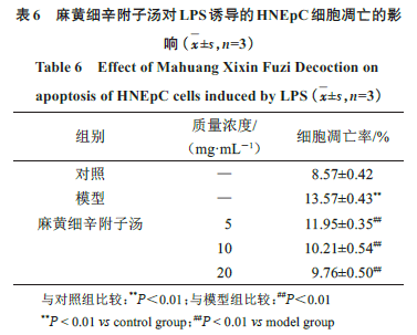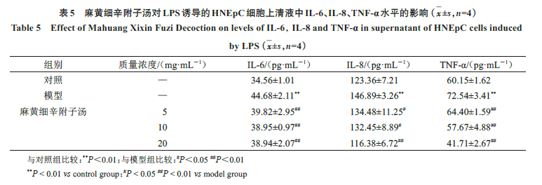 2.2.2麻黄细辛附子汤对LPS诱导的HNEpC细胞上清液中IL-6、IL-8、TNF-α水平的影响与对照组比较,模型组上清液中IL-6、IL-8、TNF-α水平显著升高(P<0.01);与模型组比较,麻黄细辛附子汤各给药组上清液中IL-6、IL-8、TNF-α水平显著降低(P<0.05、0.01),见表5。
