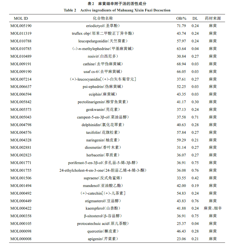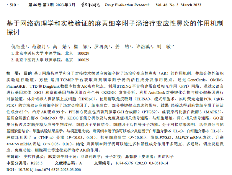 变应性鼻炎(AR)是全球最常见的慢性疾病之一,是由过敏原刺激、免疫球蛋白E(IgE)介导的Ⅰ型反常反响,临床表示为鼻塞、鼻痒、喷嚏、流涕、嗅觉减退等 [ 1]。盛行病学调查显现,全世界约有20%的人口患有AR,延展中国度的发病率正逐步上升 [ 2]。AR虽不至要挟患者生命,但它是许多并发症的基础,是哮喘控制不佳的主要风险要素,并严重影响工作、生活,降低社会生产力,构成庞大的经济损失 [ 3]。 AR属中医学“鼻鼽”“鼽嚏”“鼽水”等范畴 [ 4],中医理论多以为本病表寒外束为标,而少阴阳虚为本,症似外感,却正气已虚,临床常用麻黄细辛附子汤发散风寒、温阳扶正 [ 5-6]。麻黄细辛附子汤出自《伤寒论》,由麻黄、细辛、附子组成,方中麻黄发汗散寒以解太阳之表,附子温里助阳以扶少阴之虚,细辛通窍利肺,散寒破阴,以助麻附之用。大量临床和实验研讨均证明麻黄细辛附子汤对防治AR优势显著、效果突出 [ 7-9]。药理学研讨表明,麻黄细辛附子汤具有抗炎、抗过敏、免疫调理等作用 [ 10],但其治疗AR的主要活性成分及分子机制尚未完整阐明。 网络药理学以疾病-基因-靶点-药物之间的相互作用为基础,从生物系统的角度构建相关网络,从而全面评价中药对疾病的潜在治疗作用 [ 11-13]。本研讨拟采用网络药理学措施分离实验研讨讨论麻黄细辛附子汤治疗AR的潜在作用机制。 1资料与措施 1.1网络药理学和分子对接研讨 1.1.1麻黄细辛附子汤成分及靶点的获取经过中药系统药理学数据库与剖析平台(TCMSP,https://tcmspw.com/tcmsp.php)对麻黄细辛附子汤(麻黄、细辛、附子)各药活性成分进行检索,以口服生物应用度(OB)≥30%和类药性(DL)≥0.18为条件进行选择,同时参考文献报道,弥补了11个未抵达选择规范,但含量高及生物学效能强的活性成分。在TCMSP平台对活性成分进行靶点预测,并经过UniProt(https://www.uniprot.org/)数据库将靶点蛋白称号转化为对应的基因称号。 1.1.2AR靶点选择及中药-活性成分-靶点网络的绘制在GeneCards数据库(http://www.genecards.org/)(relevance score≥1)、OMIM数据库(http://www.omim.org/)、PharmGKB数据库(https://www.pharmgkb.org/)、TTD数据库(http://db.idrblab.net/ttd/)和DrugBank数据库(https://go.drugbank.com/)中以“allergic rhinitis”为关键词进行检索,将5个数据库的结果取并集并删除重复值,即为AR相关靶点。运用Venny(https://bioinfogp.cnb.csic.es/tools/venny/)工具,将麻黄细辛附子汤成分相关靶点与AR靶点取交集并绘制韦恩图。交集靶点导入Cytoscape 3.7.1软件,绘制中药-活性成分-靶点网络。 1.1.3蛋白质相互作用(PPI)网络的构建应用STRING平台(https://string-db.org/cgi/input.pl)对交集靶点进行PPI网络构建,设置物种为“Homo sapiens”,蛋白相互作用阈值设定为“Medium confidence”(0.400),所得结果由Cytoscape进行可视化处置,运用Cytoscape-CytoNCA插件进行剖析,选择出中心靶点。 1.1.4基因本体(GO)和京都基因与基因组百科全书(KEGG)富集剖析应用R言语对交集靶点进行GO和KEGG富集剖析,限定P<0.05,物种为人类。将GO中排名前10的细胞组分(CC)、分子功用(MF)、生物过程(BP)及KEGG排名前30的通路按P值升序排序制造气泡图。 1.1.5分子对接分子对接考证关键活性成分槲皮素、山柰酚、芹菜素、木犀草素、伪麻黄碱、麻黄碱、豆甾醇与中心靶点前列腺素G/H合成酶2(PTGS2)、转录因子AP-1(JUN)、丝裂原活化蛋白激酶3(MAPK3)、半胱氨酸天冬氨酸蛋白酶-3(CASP3)、蛋白激酶B1(AKT1)、基质金属蛋白酶-9(MMP-9)的分离活性。经过PubChem平台获取主要活性成分的2D SDF结构,应用ChemBio3D对其能量最小化处置,经过RSCB PDB(http://www.rcsb.org/)数据库获取关键靶点的蛋白质结构,应用PyMol去除水和小分子配体,经AutoDockTools加氢原子后转换成PDBQT格式用于对接,运用AutoDock Vina对接并评价其分离才干,用Pymol软件可视化处置。 1.2体外细胞实验考证 1.2.1 资料(1)细胞:人鼻黏膜上皮细胞(HNEpC)购于北纳创联生物科技有限公司(货号:356247)。(2)组方药材及水煎液制备:麻黄、细辛、附子3味中药均购自北京仟草中药饮片有限公司,批号分别为190220004、190424006、190314002,经北京中医药大学中药学院杨瑶珺教授审定:麻黄为麻黄科植物草麻黄Ephedra sinicaStapf的单调草质茎,细辛为马兜铃科植物北细辛Asarum heterotropoidesFr. Schmidt var. mandshuricum (Maxim.)Kitag.的单调根及根茎,附子为毛茛科植物乌头Aconitum carmichaeliDebx. 的子根的加工品,均契合《中国药典》2020年版规范,质量良好。称取麻黄6 g、细辛3 g、附子9 g,常规措施煎煮,浓缩,制成1 g·mL-1水煎液,4 ℃、12 000 r·min-1离心30 min,搜集上清液,0.22 μm细菌滤器滤过后置于-20 ℃备用。(3)试剂与仪器:EMEM培育基购自上海逍鹏生物有限公司;胎牛血清购自美国Hyclone公司;脂多糖(LPS)购自美国Sigma公司;CCK-8试剂盒、Annexin V-FITC/PI 细胞凋亡检测试剂盒购自北京兰博利德商贸有限公司;白细胞介素-8(IL-8)ELISA试剂盒购自江苏科特生物科技有限公司;白细胞介素-6(IL-6)、肿瘤坏死因子-α(TNF-α)ELISA试剂盒购自江苏酶标生物科技有限公司;RNA提取试剂盒、反转录试剂盒、SYBR Green预混型qPCR试剂盒购自湖南艾科瑞生物工程有限公司;所用实时荧光定量PCR(qRT-PCR)引物由北京鼎国昌盛生物技术有限义务公司合成,见表1。多功用酶标仪,美国Thermo公司;流式细胞仪,美国BD Biosciences公司;qRT-PCR仪,美国Bio-Rad公司。