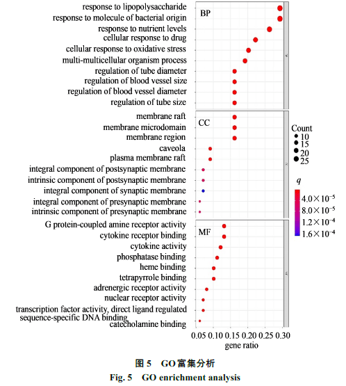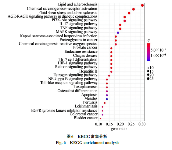 2.1.3GO和KEGG富集剖析GO 剖析结果表明,靶点主要触及对脂多糖的反响、对细菌来源分子的反响等BP;参与调理G蛋白偶联胺受体活性、细胞因子受体分离、细胞因子活性等MF;富集于膜筏、微膜区等CC,见图5。KEGG剖析结果表明,基因主要富集于白细胞介素-17(IL-17)、肿瘤坏死因子(TNF)、辅助性T细胞(Th)17分化、核因子-κB(NF-kappa B)等免疫炎症相关通路;磷脂酰肌醇3-激酶/蛋白激酶B(PI3K-Akt)、丝裂原活化蛋白激酶(MAPK)、细胞凋亡等细胞存活、分化、增殖、凋亡相关通路,见图6。