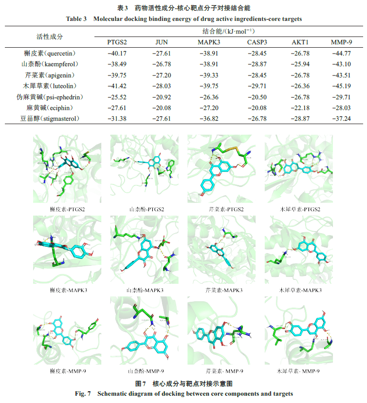 2.1.4分子对接结果应用Autodock软件将中药-活性成分-靶点网络中度值最高的7个活性成分与PPI网络中6个中心靶点进行分子对接,取得分离能,见表3。普通以为分离能越小代表靶基因与活性成分分离越紧密,分离能小于-17.78 kJ·mol-1表示配体与受体有一定的分离活性,小于-20.92 kJ·mol-1有较好的分离活性,小于-29.29 kJ·mol-1有激烈的分离活性 [ 14]。结果显现,除了麻黄碱、伪麻黄碱与JUN、CASP3有一定的分离活性,其他活性成分与靶点之间具有较好或激烈的分离活性。依据分离能大小,将PTGS2、MAPK3、MMP-9与槲皮素、山柰酚、芹菜素、木犀草素对接结果进行可视化,见图7,后续实验选择此3个靶点进行考证。