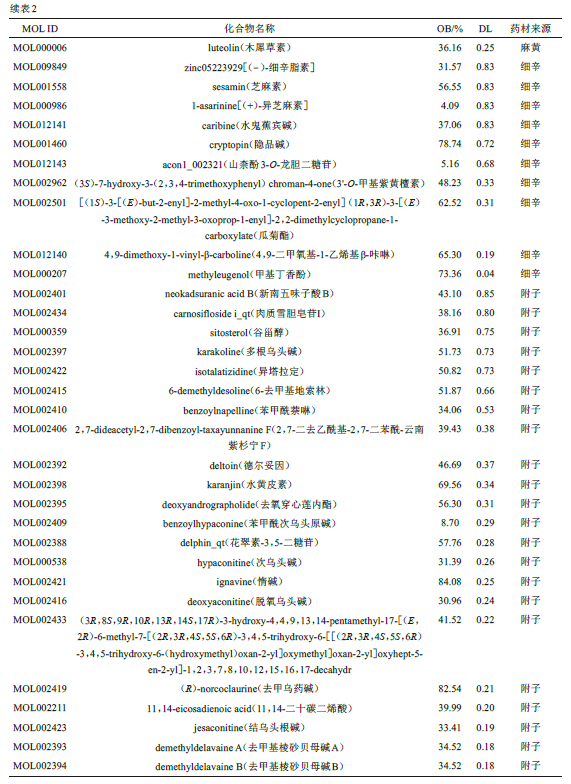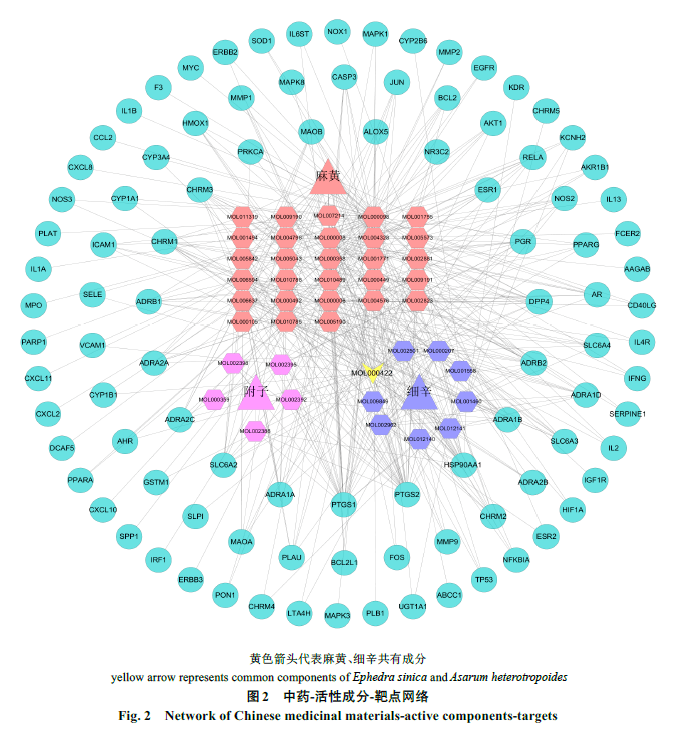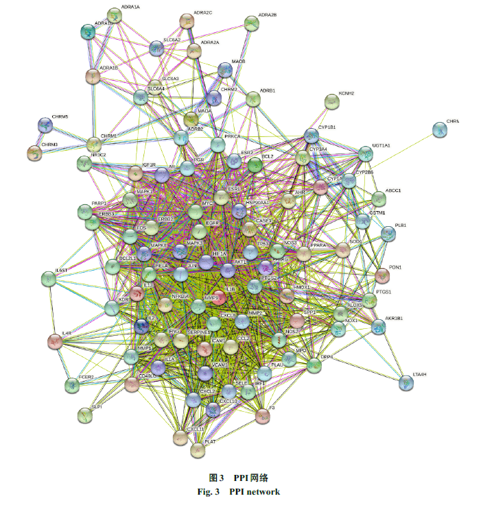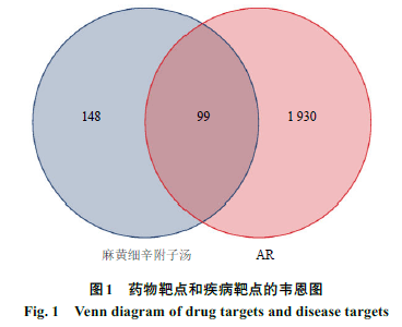 1.2.2细胞培育HNEpC以EMEM完整培育基(含10%胎牛血清及1%双抗),置于37 ℃、5% CO 2 培育箱内培育,取对数生长期细胞进行实验。 1.2.3CCK-8法检测细胞存活率将HNEpC以每孔5×10 4 个接种于96孔板中,培育箱内培育24 h,空白组(不含细胞)、对照组内参与培育基,麻黄细辛附子汤组依次参与1、5、10、20、50 mg·mL-1不同质量浓度的麻黄细辛附子汤水煎液,24 h后参与10 μL CCK-8溶液,培育箱内避光孵育30 min,450 nm处测定各孔吸光度(A)值,计算细胞存活率。 细胞存活率=(A给药-A空白)/(A对照-A空白) 1.2.4麻黄细辛附子汤对LPS诱导HNEpC细胞炎症因子、细胞凋亡及中心靶点mRNA表白的影响将HNEpC以每孔5×10 5 个接种于6孔板中,培育箱内培育24 h后进行干预给药。分为对照组、模型组(5 μg·mL-1LPS)及低、中、高质量浓度麻黄细辛附子汤组(5 μg·mL-1LPS+5、10、20 mg·mL-1麻黄细辛附子汤水煎液),继续培育24 h后,搜集细胞和上清用于后续实验研讨。 (1)ELISA法检测各组细胞上清IL-6、IL-8、TNF-α水平依照ELISA试剂盒阐明书步骤分别检测各组细胞上清液中IL-6、IL-8、TNF-α水平。 (2)流式细胞仪检测各组细胞凋亡运用不含EDTA的胰蛋白酶消化细胞,1 500 r·min-1离心5 min,PBS洗2次后,用100 L分离缓冲液重悬细胞,参与5 L Annexin V-FITC,室温避光孵育10 min,上机前5 min参与10 L PI,并在流式管中补加400 L PBS,流式细胞仪检测,Flowjo软件剖析结果。 (3)qRT-PCR检测中心靶点PTGS2、MAKP3、MMP-9mRNA表白提取细胞总RNA,检测RNA浓度,反转录为cDNA,进行荧光定量PCR反响,反响条件:95 ℃,10 min;95 ℃,5 s;60 ℃,30 s;40次循环。以GAPDH作为内参,数据采用2-ΔΔ C t 措施进行剖析。 1.3统计学措施 数据采用SPSS 20.0统计软件进行剖析,以表示。多组样本间比较采用单要素方差剖析,方差齐时,用LSD法进行多重比较,方差不齐则采用非参数检验。P<0.05表示差别具有统计学意义。 2结果 2.1网络药理学及分子对接研讨结果 2.1.1麻黄细辛附子汤治疗AR的作用靶点预测经过检索得到麻黄细辛附子汤活性成分62个,见表2,作用靶点247个,AR靶点2 029个。将麻黄细辛附子汤成分靶点与AR疾病靶点取交集后得到99个共同靶点,见图1。用Cytoscape软件构建中药-活性成分-靶点网络,见图2。对节点拓扑参数进行剖析,其中槲皮素、山柰酚、芹菜素、木犀草素、伪麻黄碱、麻黄碱、豆甾醇度值均≥20,可能是麻黄细辛附子汤治疗AR的主要活性成分。