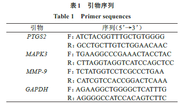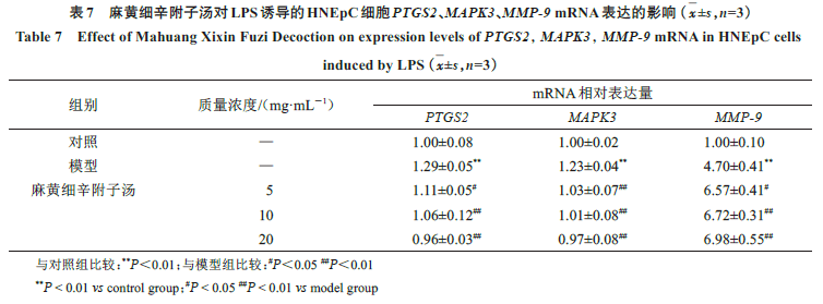 2.2.4麻黄细辛附子汤对LPS诱导的HNEpC细胞PTGS2、MAPK3、MMP-9mRNA表白的影响与对照组比较,模型组细胞中PTGS2、MAPK3、MMP-9 mRNA表白水平显著增加(P<0.01);与模型组比较,麻黄细辛附子汤各给药组干预后细胞中PTGS2、MAPK3mRNA表白水平显著降低(P<0.05、0.01),MMP-9mRNA表白水平显著增加(P<0.05、0.01),见表7。