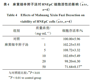 2.2体外实验考证结果 2.2.1麻黄细辛附子汤对细胞活性的影响CCK8 检测结果显现,与对照组比较,麻黄细辛附子汤质量浓度低于20 mg·mL-1对细胞存活率影响不显著,而麻黄细辛附子汤质量浓度为50 mg·mL-1时,细胞存活率显著降低(P<0.01),见表4,因而选择5、10、20 mg·mL-1的给药质量浓度进行后续实验。