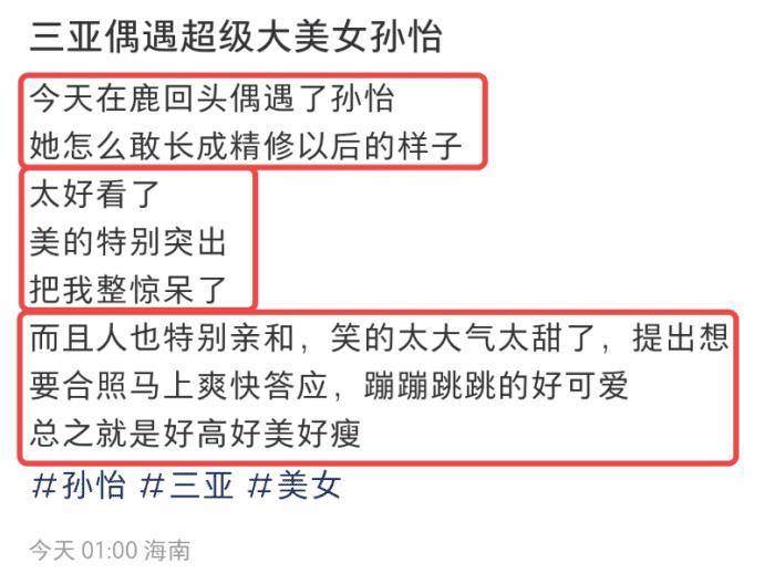 事情湖南 3月4日,有网友晒出了一张在三亚鹿回头景区偶遇孙怡的合影,并称誉她的颜值和性格。 博主表示孙怡敢长成精修以后的样子。她是如此美丽,致使于他感到诧异。他也很友善,笑容甜美,蹦蹦跳跳的很心爱。孙怡也直爽地允许了路人的合影请求。