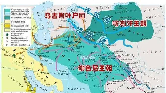 当时由西北印度出色的降服者马赫穆德苏丹统治的另一个突厥王朝--伽色尼王朝,夺得了萨曼王朝遗产中的阿姆河以南的呼罗珊。 两个穆斯林突厥王朝最初的关系是友好和睦的,阿尔斯兰伊列克纳斯尔还将自己的女儿嫁给了马赫穆德为妻。但这种友好的关系是十分短暂的。喀喇汗王朝不只统治着喀什噶尔,还统治着伊犁河和楚河流域的这一大片原突厥疆土,因而它以正统的突厥王朝自居,视曾经为奴隶的伽色尼王朝的统治者们为爆发户。