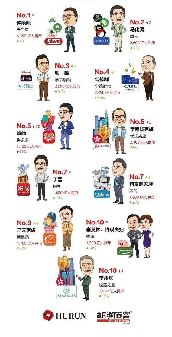 “伯纳德·阿诺特成为十年来第五位世界首富,前面十年简直全是比尔·盖茨,这十年变更较大,其他四位当过世界首富的是墨西哥电信公司的斯利姆、比尔·盖茨、杰夫·贝佐斯和埃隆·马斯克。”胡润百富董事长兼首席调研官胡润表示。 胡润表示,“在ChatGPT和电动汽车反动的时期,世界首富是卖奢侈品的,这似乎有点矛盾。固然生活成本危机带来种种不肯定性,LV、爱马仕、古驰、香奈儿、卡地亚、百达翡丽和普拉达的掌门人们还是阅历了创纪录的一年,欧美和日本的销售额飙升,大批美国消费者应用美圆汇率优势前往英国和欧洲购物。” 钟睒睒蝉联中国首富 黄峥为中国财富增长最多的企业家 国内方面,钟睒睒蝉联中国首富,财富为4650亿元,全球排名第15,与去年坚持分歧。去年,钟睒睒旗下香港上市公司农夫山泉业绩稳步增长,目前市值4500亿元。 马化腾财富降落25%,至2600亿元,位列中国第二,全球第31位,比去年降落3位。腾讯今年共有6人上榜,分别为马化腾、张志东、刘炽平、陈一丹、张小龙、许晨晔。 40岁的张一鸣财富降落31%,至2500亿元,位列中国第三,全球第34位,比去年降落11位。字节跳动的全球月活用户数曾经超越25亿。去年全年营收估量6000亿元,同比增长56%,净利润估量1500亿元。 宁德时期曾毓群财富降落34%,至2350亿元,位列中国第四,全球第37位,比去年降落13位。宁德时期是目前中国最大的锂电池生产企业,但遭到新能源汽车行业大环境的影响,宁德时期过去一年股价下跌明显。 拼多多的黄峥是中国财富增长最多的企业家,增长了800亿元,至2100亿元,位列中国第五,全球第39位,比去年上升54位,主要得益于过去一年在中概股市场的优秀表示和拼多多的股价恢复。95岁的李嘉诚及其家族财富降落6%至2100亿元,并列中国第五。 网易丁磊财富降落18%至1800亿元,位列中国第七,全球第46位,比去年降落9位。去年网易完成总营收965亿元,归属股东净利润抵达228亿元,较上一年同期均有所增长,而收入的主要来源还是在游戏业务。美的何享健及其家族财富1800亿元,与丁磊并列中国第七,全球第46位。 马云位列中国第九,全球第52位,财富降落32%至1700亿元。马云财富减少主要由于上市公司阿里巴巴的市值及独角兽公司蚂蚁集团的估值在过去一年均有所降落,目前阿里巴巴市值1.6万亿元。 牧原股份的秦英林、钱瑛夫妇财富降落18%,至1550亿元,位列中国第十,全球第59位,比去年降落13位。95岁的李兆基同样以1550亿元的财富值,并列中国第十。今年2月,恒基地产与兴业银行签署300亿元绿色及可持续延展战略协作协议,在绿色建筑、零碳智能园区以及ESG体系树立等范畴携手响应双碳目的。