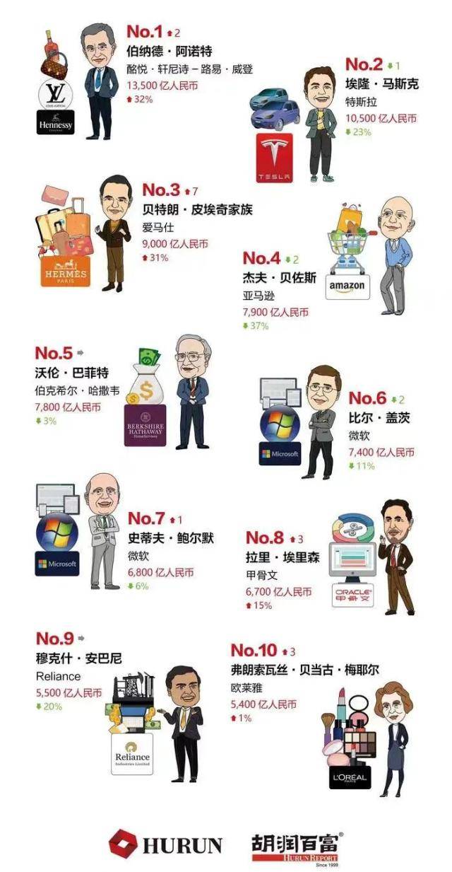 全球首富换人了!3月23日,胡润研讨院发布“胡润全球富豪榜”。其中,LV总裁首登全球首富,特斯拉开创人马斯克退居第二,另一奢饰品品牌爱马仕的贝特朗·皮埃奇家族,以9000亿元排名第三。 从国内状况来看,钟睒睒蝉联中国首富,马化腾、张一鸣位列中国第二、第三,而拼多多的黄峥成为中国财富增长最多的企业家,位列中国第五。 LV总裁首登全球首富 马斯克退居第二 3月23日,胡润研讨院发布“胡润全球富豪榜”。值得留意的是,今年全球富豪榜的前三位中有两位都是奢饰品品牌掌舵者,而马斯克退居第二,贝佐斯六年来初次跌出前三名,比尔·盖茨初次跌出前五名。 其中,“奢侈品之王”、LVMH 74岁的伯纳德·阿诺特上升两位,初次成为世界首富,财富增长3300亿元,至1.35万亿元人民币。同时也成为全球财富增长最多的企业家。阿诺特带领LVMH成为欧洲最有价值的企业,在创纪录的150亿美圆利润和860亿美圆销售额的支持下,其股价上涨了30%以上。阿诺特今年1月任命47岁的女儿德尔菲娜掌管迪奥。 埃隆·马斯克降落一位至第二,财富1万亿元人民币,比去年减少3200亿元,主要由于特斯拉市值下跌。去年特斯拉市在缩水了7000亿美圆,今年上涨了65%。马斯克去年向慈悲机构捐赠了19亿美圆的特斯拉股票。 爱马仕的贝特朗·皮埃奇家族上升7位,排名第三,财富增长2100亿元,抵达9000亿元人民币。爱马仕家族承诺至少20年内不会出卖其在该公司的股份,此举旨在抵御LVMH的歹意收买。爱马仕去年利润抵达创纪录的36亿美圆。 杰夫·贝佐斯以7900亿元人民币的财富排名第四,减少了4700亿元,这是今年最大的财富减少值。贝佐斯六年来初次跌出前三名。在生活成本危机、经济衰退和利率上升引发的更普遍的科技股兜售之际,亚马逊失去了一切由新冠大盛行带来的增长。 93岁的沃伦·巴菲特坚持了前五名的位置,财富7800亿元人民币,减少了200亿元。固然通货收缩加剧和供给链中缀,伯克希尔·哈撒韦公司仍发明了310亿美圆的利润。 68岁的比尔·盖茨自胡润全球富豪榜成立以来,初次跌出前五名,排名第六,财富7400亿元人民币,主要来自他的投资公司Cascade,今年还向他的基金会捐赠了50亿美圆。 排名第七位的是史蒂夫·鲍尔默,财富6800亿元人民币。鲍尔默具有微软4%的股份,是世界上最富有的体育老板,八年前以20亿美圆收买洛杉矶快船队。 甲骨文公司79岁的拉里·埃里森上升三位,至第八名,财富抵达6700亿元人民币。埃里森五年来初次重返胡润全球富豪榜前十,主要得益于甲骨文云业务的增长。 印度Reliance的穆克什·安巴尼依然坚持第九名,重夺印度和亚洲首富的头衔。 欧莱雅的弗朗索瓦丝·贝当古·梅耶尔初次跻身前十,财富5400亿元,成为世界女首富,她的财富主要来自欧莱雅35%的股份。