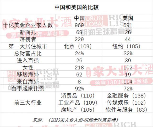 蜜雪冰城开创人财富涨幅最大 此外值得一提的是,中国的企业家中,今年涨幅最大的是蜜雪冰城45岁和38岁的张红超、张红甫兄弟,财富均增长320%至280亿元,提升中国前200名。医疗设备企业联影医疗62岁的薛敏财富上涨307%至380亿元,进入中国前130名。 而财富降落最快的是红星美凯龙的车建兴,降落了84%,缩水至67亿元;其次是龙光地产的纪海鹏家族,降落72%至100亿元;中公教育的鲁忠芳、李永新母子,降落69%至100亿元;富途证券的李华,降落69%至230亿元。 最年轻的白手起家的是38岁和30岁的韩玉龙、陆剑霞夫妇,他们将Manner咖啡打构成了数十亿美圆的公司,他们自己成为十亿美金企业家。 胡润表示,“中国是世界上已知十亿美金企业家最多的国度,比美国多40%。2016年,中国的世界级企业家人数初次超越了美国。” 整体来看,“2023胡润全球富豪榜”变动猛烈,去年有445人落选,是历年来落榜人数最多的一次。全球富豪榜中国固然减少了164位,仍以969位十亿美金企业家领跑全球;美国第二,有691位,减少25位。中国和美国具有全球53%的十亿美金企业家。
