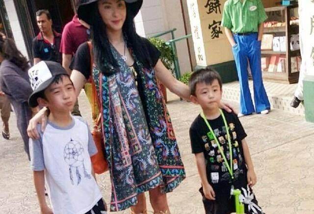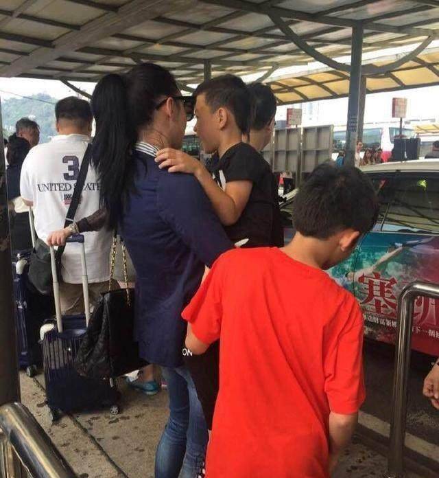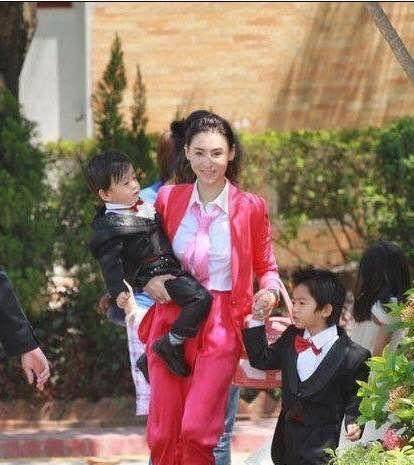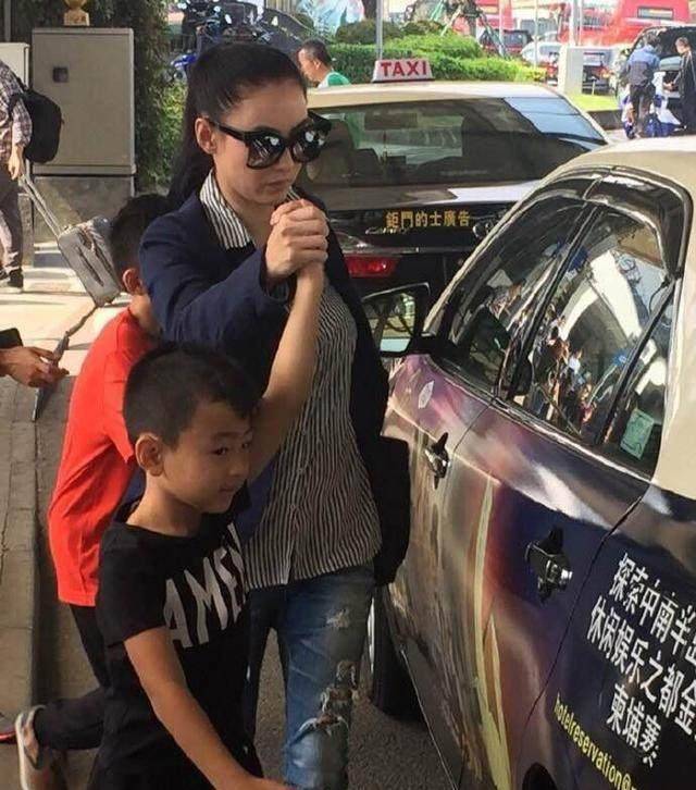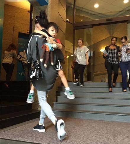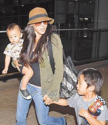 瘦弱的张柏芝右手抱着小的,左手牵着大的。着实看的累。
