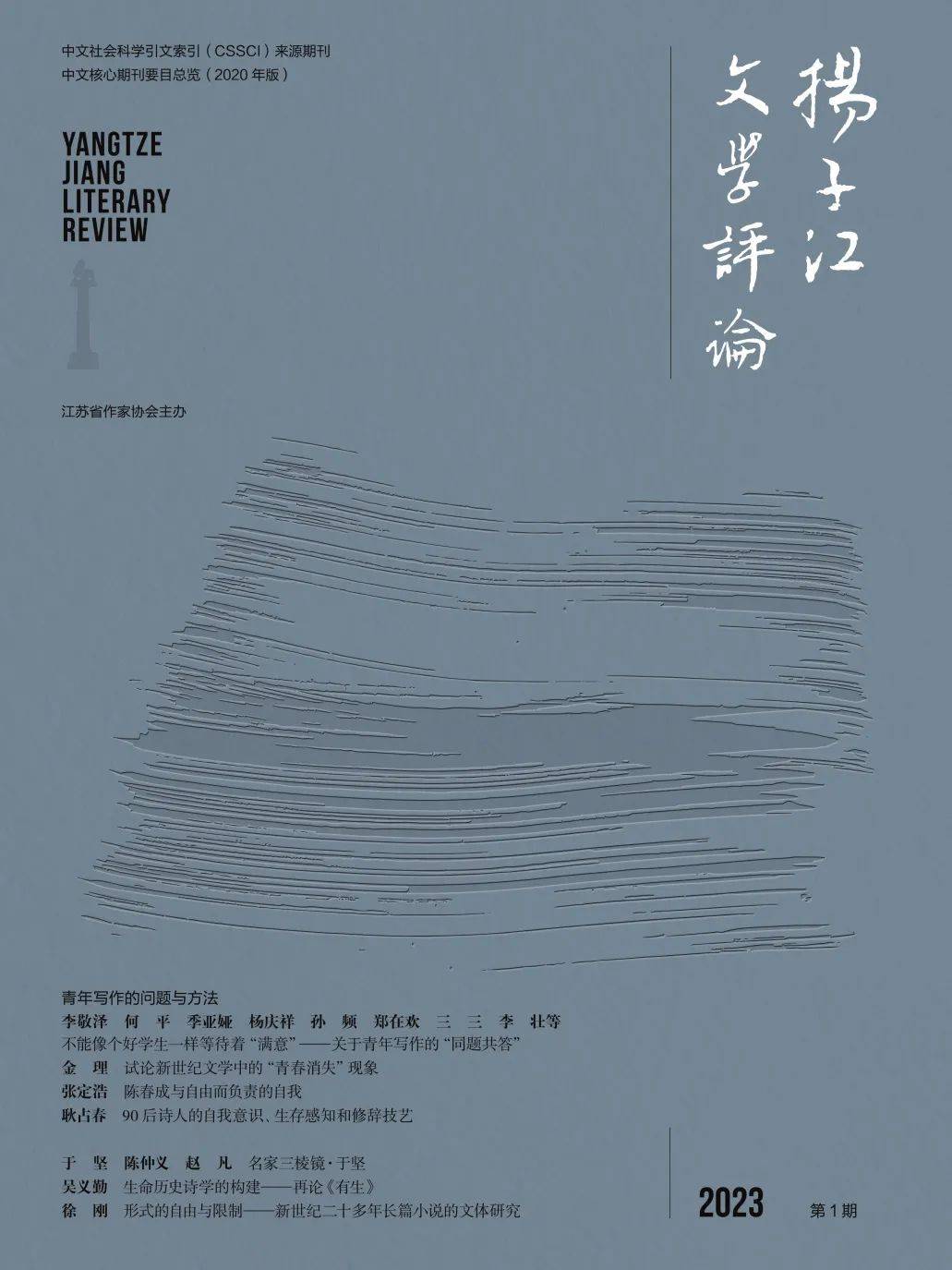 青年写作的问题与方法 李敬泽、何平、季亚娅、杨庆祥、孙频、郑在欢、三三、李壮等|不能像个好学生一样等待着“满意”——关于青年写作的“同题共答” 金 理|试论新世纪文学中的“青春消失”现象 张定浩|陈春成与自由而负责的自我 耿占春|90后诗人的自我意识、生存感知和修辞技艺 名家三棱镜 · 于坚 于 坚|写作之道 陈仲义|叙述与抒情的 “博弈”——以于坚诗为中心 赵 凡|重建内在性——读于坚新诗集《漫游》 作家作品论 吴义勤|生命历史诗学的构建——再论《有生》 郭冰茹|空间书写与个人生活史的建构——读杨本芬《秋园》系列 王春林|历史人质与南京现代性——关于叶兆言长篇小说《仪凤之门》 朱 婧|谁在野?望什么?——《野望》论 郑斯扬|西海固的女儿——马金莲论 文学史新视野 徐 刚|形式的自由与限制——新世纪二十多年长篇小说的文体研究 / / 邮箱|yzjwxpl2020@163.com |