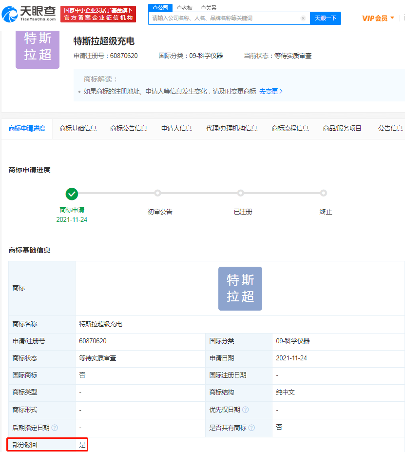特斯拉申请超级充电商标被驳回 据天眼查App显示,近期,特斯拉(上海)有限公司申请注册的多项超充相关商标流程变更为驳回通知发文,这些商标申请于2021年11月,包括“特斯拉超级充电”“特斯拉超充”“超级充电”“超级充电桩”“超级充电站”“TESLA SUPERCHARGER”等,国际分类为科学仪器。