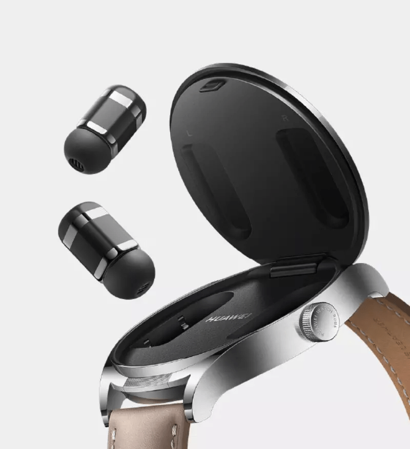外观结构方面,华为WATCH Buds采用官方号称“业界首款”的弹盖磁吸式设计,打开表盘,即可取出放置在表内的一对真无线耳机。其采用的创新聚磁阵列方案,使耳机能够四面吸附于表盖内,便于取用与放回。