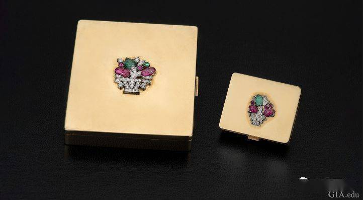 GIA 讲师 Doug Hall(道格·霍尔)说:“明星以前旅行时,常常没有珠宝旅行箱这类东西来保证他们的首饰和个人物品的安全,所以,看到一名贵妇使用旧雪茄盒、咖啡罐、烟罐等这些东西来装珠宝和化妆品,这一点都不奇怪。” 面对此种情况,梵克雅宝等著名珠宝公司快速响应,开发了优雅的粉盒来装这些物品,他补充道。这些盒子可能极具个性,并缀以宝石和图案。