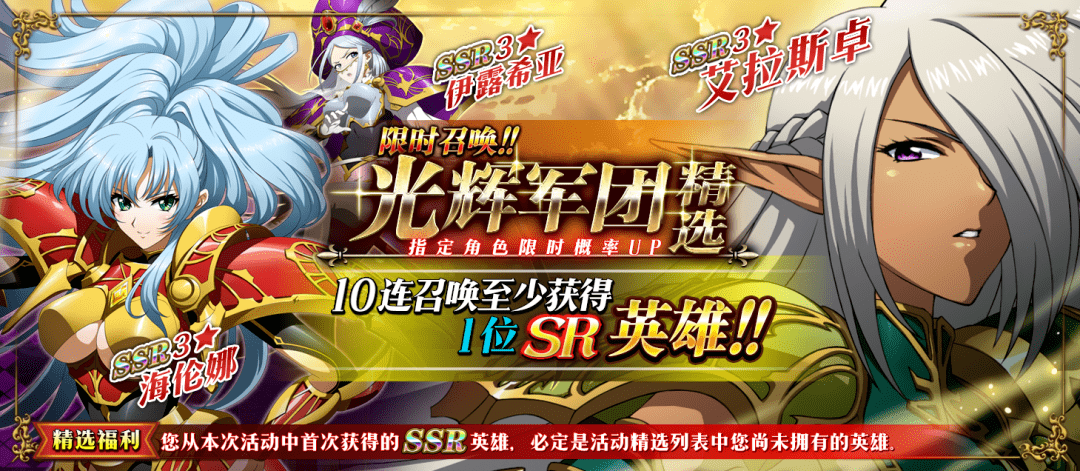 Langrisser传说,由你书写! 勇士们吹响了策略比拼的号角,公平竞技场限时回归;圣剑的永恒辉光重燃战场,精选卡池即将开启!指挥官们,准备好接受挑战了吗? 由于英雄之路大区所有服务器涉及机房调整,本次更新维护时间临时调整为11月26日8:30开始。请指挥官合理安排游戏时间,避免受到损失。维护期间指挥官无法登录服务器,给您带来的不便敬请谅解。 启源之地大区、艾露萨利亚大区、时空裂缝大区: 维护时间 11月26日8:30,预计维护90分钟 维护补偿 金币*5W 工匠之锤高级*3 英雄之路大区: 维护时间 11月26日8:30,预计维护5小时 维护补偿 金币*5W 工匠之锤高级*3 由于英雄之路大区更新维护预计时间较长,维护完成后,我们将会根据具体维护时长为英雄之路大区的指挥官发放一定的额外补偿。 更新完成后,英雄之路大区部分指挥官在首次登录时可能会遇到连接失败的问题,重新登录即可正常进入游戏。 限时召唤 光辉军团精选 当暗夜笼罩大陆之时,圣剑的召唤之声再次鸣响……与正义的伙伴并肩而行,用不灭的辉光重燃战场!