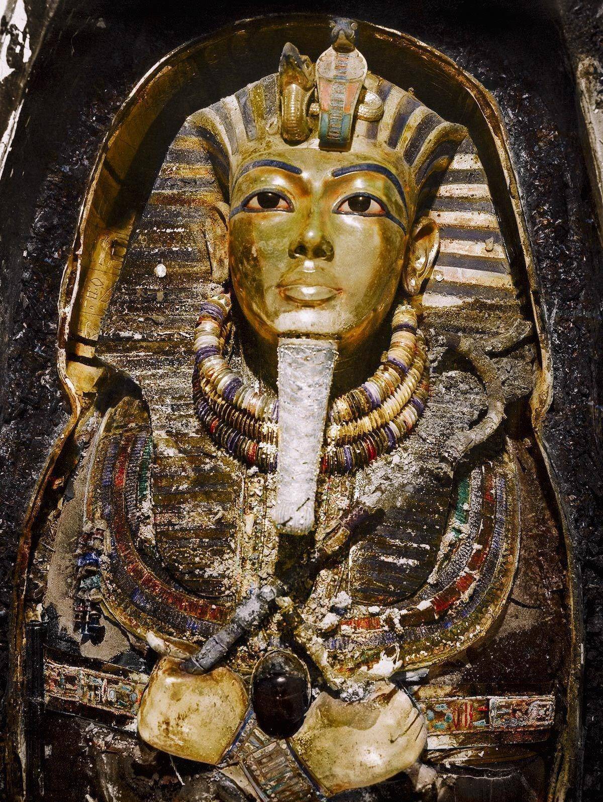 【图坦卡蒙木乃伊】这是最激动人心地发现,霍华德·卡特回忆时说:“移去棺盖,揭开一层层包布,里面是一具人形木质金像棺,上面雕刻着图坦卡蒙的头像,脸和手用纯金铸成,眼睛是黑曜石的,眉和眼睑是青石玻璃的。法老右手执权杖,左手握冥王神鞭,两手在胸前交叉。”