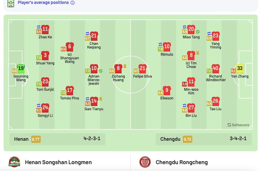 【出场阵容】河南:19-王国明、3-杨帅、11-柯钊、23-舒尼奇、24-李松益(46’4-罗歆)、6-王上源、10-阿德里安、14-高天语、17-皮纳、21-陈客强(61’29-钟义浩)、8-黄紫昌 成都蓉城:33-张岩、20-唐淼(59’17-甘锐)、23-杨一鸣(59’13-胡靖)、26-刘涛、27-刘斌(84’39-甘超)、40-理查德、8-周定洋、10-罗慕洛(84’7-帕拉西奥斯)、11-金敃友、9-艾克森、21-费利佩 |