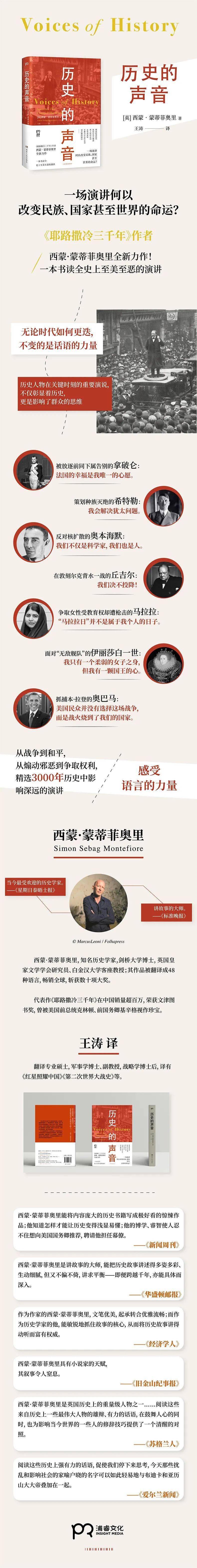 【内容简介】 《历史的声音》收录了史上至美至恶的演讲。这些演讲,有的英勇而鼓舞人心,有的邪恶而残暴,有的凄美、温暖。我们不仅可以看到苏格拉底、亚历山大大帝、丘吉尔、希特勒等人的出场,更是可以看到他们在关键时刻,如何凭借语言的力量,或是捕捉到了时代的真理,或是扯下了弥天大谎,从而影响了群众的思维,改变了历史的进程。 像一位讲故事的大师,历史学家西蒙·蒙蒂菲奥里以扣人心弦的风格讲述了这些演讲及其背后的故事。战场上的屠杀、对自由的高呼、愚蠢的妄想、令人心碎的告别……这些发生于世界各地、跨越千年的故事,告诉我们历史是如何走到了今天,它们对未来又有着怎样的启发意义。 【作者简介】 西蒙·蒙蒂菲奥里被誉为“当今受欢迎的历史学家”,他是剑桥大学博士,英国皇家文学学会研究员、白金汉大学客座教授;其作品被翻译成48种语言,畅销全球,斩获数十项大奖。代表作《耶路撒冷三千年》在中国销量超百万,荣获文津图书奖,曾被美国前总统克林顿、前国务卿基辛格视作珍宝。 【目录】 前言/1 抗争篇/001 布狄卡:“这是一个女人的决心”公元61年/003 伊丽莎白一世:“国王的心灵和勇气”1588年8月8日/005 以利亚撒·本·亚尔:“让我们在被敌人奴役之前慷慨赴死”公元73年/008 温斯顿·丘吉尔:“热血、辛劳、眼泪和汗水”1940年5月13日/015 埃米琳·潘克赫斯特:“我作为一名……战士来到这里”1913年11月13日/019 梦想篇/023 马丁·路德·金:“我有一个梦想”1963年8月28日/025 索杰纳·特鲁斯:“难道我不是女人?”1863年版,由弗朗西丝·盖奇记录/033 穆罕默德·阿里:“等着,你们会看到穆罕默德·阿里”1974年10月30日/039 米歇尔·奥巴马:“尽自己的全力做到好”2009年4月2日/042 自由篇/049 西蒙·玻利瓦尔:“我们不是欧洲人,我们不是印第安人,但我们有着原住民和西班牙人的混合血统”1819年2月15日/051 杜桑·卢维杜尔:“我希望自由和平等在圣多曼格成为主流”1793年8月29日/054 贾瓦哈拉尔·尼赫鲁:“在午夜钟声敲响的时候”1947年8月14日/056 纳尔逊·曼德拉:“彩虹之国”1994年5月10日/060 温斯顿·丘吉尔:“我们要在滩头作战”1940年6月4日/064 兴衰篇/067 穆阿维叶:“他们拉紧的时候,我就松开”公元7世纪/069 伊丽莎白一世:“我依靠你们的爱治理国家”1601年11月30日/071 温斯顿·丘吉尔:“这是他们光荣美好的时刻”1940年6月18日/075 贝拉克·奥巴马:“美国是一个一切皆有可能的地方”2008年11月4日/078 正直篇/083 亚伯拉罕·林肯:“直至鞭笞流出的每一滴血都被战争中的流血偿还”1865年3月4日/085 约翰·F.肯尼迪:“不要问你的祖国能为你们做什么”1961年1月20日/090 奇玛曼达·恩戈兹·迪契:“人类能够将自己塑造得更美好”2012年12月/097 马拉拉·优素福·扎伊:“一支笔和一本书可以改变世界”2013年7月12日/102 莫罕达斯·甘地:“我相信我们事业的正义性”1930年3月11日/107 苏珊·布朗奈尔·安东尼:“妇女是人吗?”1873年2—6月/111 战场篇/117 小乔治·史密斯·巴顿:“我要亲手毙了希特勒这个纸老虎、狗杂种”1944年6月5日/119 亚历山大大帝:“你们有亚历山大”公元前333年11月/123 乔治·沃克·布什:“今天,我们的国家见识了邪恶的人性”2001年9月11日/126 富兰克林·罗斯福:“必须永远记住这个耻辱的日子”1941年12月8日/130 蔑视篇/135 克利奥帕特拉七世:“我不会因为你的胜利被呼来唤去”公元前30年/137 奥利弗·克伦威尔:“以上帝的名义,滚!”1653年4月20日/140 温斯顿·丘吉尔:“这么少的人”1940年8月20日/143 恐怖篇/145 阿布·巴克尔·巴格达迪:“宣布成立哈里发国”2014年6月29日/147 奥萨马·本·拉登:“美国被攻击”2001年10月7日/149 马克西米连·罗伯斯庇尔:“美德与恐怖”1794年2月5日/153 审判篇/159 苏格拉底:“未经审视的人生不值得过”公元前399年/161 昏招篇/169 理查德·尼克松:“白宫不允许任何洗白”1973年4月30日/171 内维尔·张伯伦:“我们这个时代的和平”1938年9月30日/175 阿道夫·希特勒:“我是世界上强大的陆军……的首领”1941年12月11日/177 力量篇/185 狄奥多拉:“皇家紫袍是贵的裹尸布”公元532年/187 亚伯拉罕·林肯:“民有、民治、民享的政府”1863年11月19日/189 唐纳德·特朗普:“让美国再次伟大”2015年6月16日/191 和平篇/201 安瓦尔·萨达特:“我来到耶路撒冷这座和平之城”1977年11月20日/203 伊扎克·拉宾:“饱含着鲜血和眼泪”1993年9月13日/209 革命篇/213 乔治·丹东:“勇敢,勇敢,再勇敢!”1792年9月2日/215 弗拉基米尔·伊里奇·列宁:“政权归苏维埃”1917年9月/217 鲁霍拉·霍梅尼:“我要把这个政府打得满地找牙”1979年2月/220 好战篇/223 乌尔班二世:“踏上赴圣地的征途吧!1095年11月27日/225 老加图:“迦太基必须毁灭!”公元前149年/230 灭绝篇/233 阿道夫·希特勒:“欧洲犹太民族彻底灭绝!”1939年1月30日/235 海因里希·希姆莱:“犹太民族将要被灭绝”1943年10月4日/237 告诫篇/243 罗伯特·奥本海默:“我们不仅是科学家,我们也是人”1945年11月2日/245 告别篇/249 爱娃·庇隆:“一如既往地忠于庇隆”1951年10月17日/251 马丁·路德·金:“我已经看到了应许之地”1968年4月3日/257 理查德·尼克松:“将来不会有任何人为她写一本书”1974年8月9日/262 小威廉·皮特:“任何个人都拯救不了欧洲”1805年11月9日/269 尼禄:“我死了,世界将会失去怎样的一位艺术