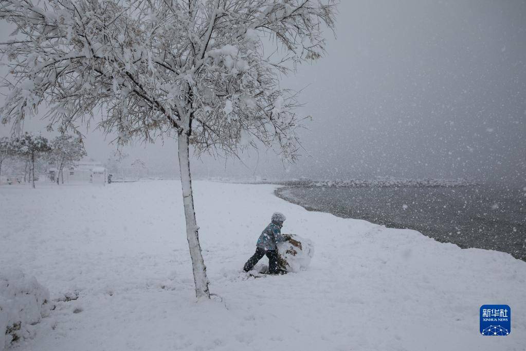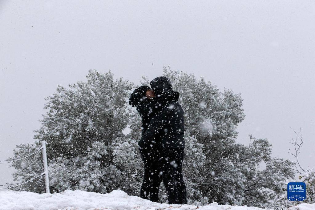 1月24日,在希腊雅典,一对情侣在雪中拥吻。新华社发(马里奥斯·罗洛斯 摄)