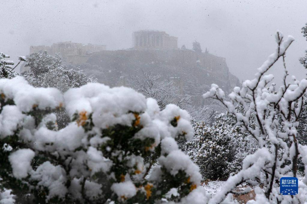 这是1月24日拍摄的雪中的希腊雅典卫城。新华社发(马里奥斯·罗洛斯 摄)