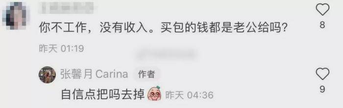 大概是安利给阔太群体的吧,有网友好奇她的收入来源:你不工作,没收入,买包的钱都是老公给的吗? 张馨月心安理得地回:自信点,把吗去掉!