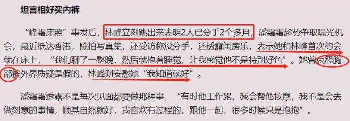 后来两人拍拖足足拍了4年,但是此时的两人事业都处在爬升期,因此两人都没有选择将恋情公开。 虽然后来,两人是承认了彼此之间的恋情,但是这对被人看好的情侣终究还是没能走到最后,2010年,两人分手了。 2011年,香港媒体突然曝光了潘霜霜和林峯大量照片,中间不乏有他们两人床上照片。 其中潘霜霜的自拍中,其惹火的身材让不少的人着迷,而其中还有一张就是林峯在身边在睡觉,而潘霜霜盖着被子,睡在林峯旁边自拍。 由此,潘霜霜和林峯的恋情才被曝光。 但是此段恋情曝光并没有获得大家的祝福,大部分人都认为潘霜霜是目的地接近林峯,只是借林峯的名气上位。 因为这些照片的角度,都是以潘霜霜自拍的角度,更何况那时候潘霜霜的咖位远远低于林峯,还处在十二线名不经传的小演员行列中。