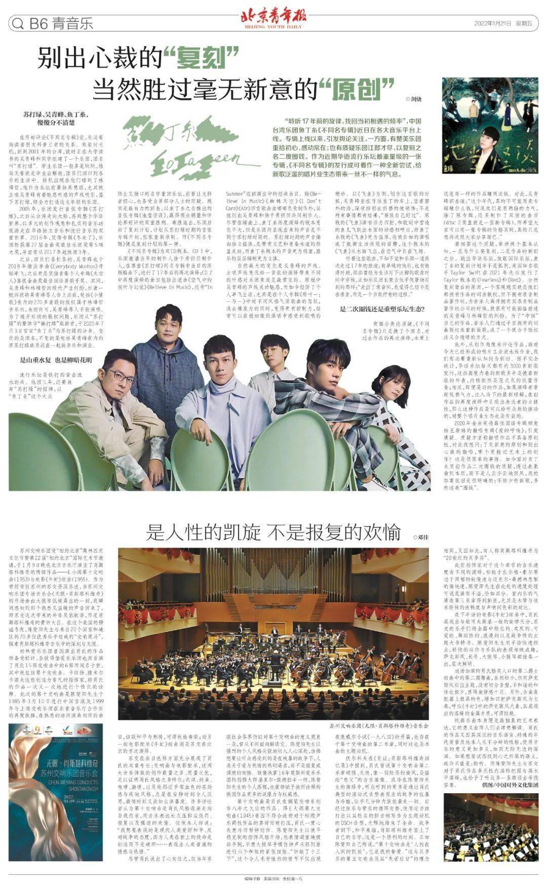 此前指挥家对于这个章节的音乐速度有不同的演绎,相较于左尔格·索尔蒂过于阴郁的较慢速与迈克尔·桑德林急掣的偏快速,陈燮阳先生在此处的速度处理可说是满而不溢,恰如其分。室内乐的气质在第三乐章得到彰显,尤其是木管与弦乐轮转的流畅度与声响间色彩的对比。 在下半场的电影《牛虻》组曲中,肖氏展现出与柴可夫斯基一般的旋律天分,苏交的乐手们将全篇中励志的、欢庆的、可爱的、舞蹈性的、浪漫的以及战争性的主题大书特书。陈燮阳先生用手指快速轻点,轻快的动作与乐队的表现相映成趣,萨克斯风、长号、大提琴、小提琴都独奏一出,层次鲜明。 返场加演的肖氏脍炙人口的第二爵士组曲中的第二圆舞曲,虽然短小,但用萨克斯风引出主题,没有切分音型,不和谐的和弦也极少,显得旋律感十足。另外,全曲在配器上极具特色,增加四把萨克斯风为主奏,呼应《牛虻》中的萨克斯风元素,其展现出的温暖的金属音质,可谓惊艳。 纯器乐曲本身便是最抽象的艺术表达,它的意义由得人们去肆意解读。肖氏的作品又因其深沉的音乐语言、特殊的年代背景及他本人从不分辩的性格,使得音乐的意义更加多义,如同无际无边的深渊。如果想要试图找到心之所属的语义,或许只能是:聆听。而陈燮阳先生与苏交对于肖氏作品多元性内涵的把握与高水平演绎,也给予了听众多一条路径去寻找答案。 文|邓佳 供图|中国对外文化集团 编辑|于静 本文刊载于北京青年报2022年1月21日B6版《青音乐》