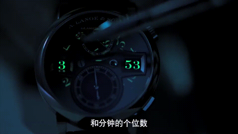 ▲朗格独特的“Lumen”夜光 所以每款“Lumen”夜光“猫头鹰”新表问世时,夜光显示的画面常常成为媒体各大头条的主要视图。暗夜时夜光显示的“猫头鹰”,会让人错觉认为它是与机械腕表在另一个世界的智能表或电子表: 数字亮显,当时当刻的小时数和分钟数更加明亮。