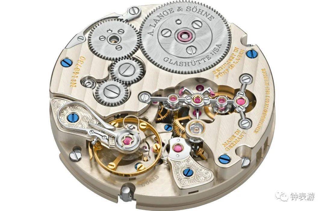▲朗格全新 L043.9型机芯正面 朗格全新 L043.9型机芯,五方位精密调校;3/4夹板由未经处理的德国银制造;手工雕刻摆轮及擒纵轮夹板;通过恒定动力擒纵系统实现的跳分装置。采用杠杆式擒纵系统和防震砝码摆轮。游丝是朗格表厂自制的优质摆轮游丝,并拥有专利摆轮游丝夹头。振频是每小时18,000次,采用结合横向固定螺丝和鹅颈式杠杆的精准微调系统。