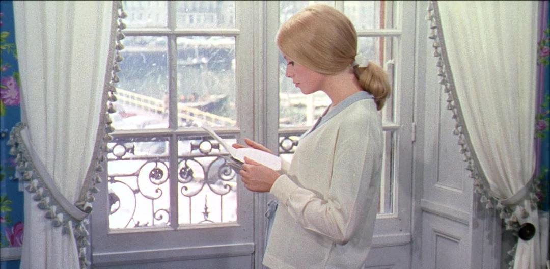 《城里的房间》 这部歌舞片没有勒格朗的参与,可能是德米最后的杰作。)德米准确地描述了热纳维耶芙的母亲(安妮·维尔侬饰)为了牢牢套住钻石商人而采取的步骤——这个计划甚至在她发现热纳维耶芙怀孕之前就开始实施了。但德米并没有讽刺或评判这一过程;他只是仔细地观察了法国人在这种情况下的行为方式。 这就是《瑟堡的雨伞》的大致内容。不过即使忽略音乐,其风格也不能说是现实主义的。德米和布景师贝尔纳·埃万重新粉刷了瑟堡的整个街区,使其色彩比现实生活中更加鲜艳和协调;类似的方法在服装方面也使用得很明显。 这种视觉细节的强调,对应着通过将对话与音乐相结合而实现的情感突出和形式锐化。(虽然勒格朗没有署名编剧,但他与负责歌词创作的德米的合作表明,他完全值得编剧的名号,因为在这部影片中,配乐和叙事是不可分割的,两者被塑造为同一架构。德米曾指出,《瑟堡的雨伞》应该被视为一部「歌曲」[in song]电影,就像有些电影是「彩色」[in color]电影一样。)让-皮埃尔·贝尔托梅写了我所知道的唯一一本关于德米的书——《雅克·德米:梦的根源》(1982,Jacques Demy: Les racines du rêve),观察细致,内容丰富——其中恰当地指出,盖伊和热纳维耶芙在两人共处的最后一晚坐在咖啡馆里的时候,连他们点的饮料(「热纳维耶芙的琥珀色餐前酒,盖伊的淡黄色茴香酒」)都与场景中的其他东西的颜色相协调。德米的视觉编排是对勒格朗的音乐编曲的完美补充;两者都创造了一种强大的情感浓度,完善或驳回了对话的平庸。