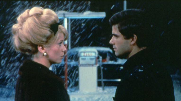 《莫里埃尔》 而在与一个妓女春宵一夜后,盖伊发现十分爱护他的伊莉斯姨妈(米蕾尔·珀雷饰)在他服役时去世了。他从她那里继承了足够的钱买下镇上的一家埃索加油站,并最终与照顾他姨妈的年轻女子玛德琳(埃朗·法尔内饰)结了婚。 时间快进到1963年的圣诞节(大约就是这部影片在巴黎首映的六周前)。盖伊和玛德琳正在埃索加油站的办公室里修剪圣诞树。他们现在养育着一个小男孩,大雪纷飞(这是另一个讽刺性的「押韵」,与开场时刻意且风格化的降雨形成对比)。玛德琳和小男孩弗朗索瓦出去散步,热纳维耶芙带着小女儿弗朗索瓦丝——她和盖伊的女儿——开着黑色奔驰车驶来。 盖伊认出了热纳维耶芙,并邀请她进到办公室。热纳维耶芙说这是她结婚后第一次来瑟堡,她刚把弗朗索瓦丝从外祖母那里带回来;她还说她的母亲已经去世了。她问盖伊是否想看看弗朗索瓦丝,他回答说:「我觉得你最好还是直接走吧。」他们临别时的对话再平淡不过了:「你一切都好吗?是的,很好。」(在一个长镜头中,当玛德琳和弗朗索瓦散步回来时,热纳维耶芙驱车离开了;盖伊在雪地里和弗朗索瓦玩了一小会儿,随即三人都回到了室内,镜头渐渐升至天空。
