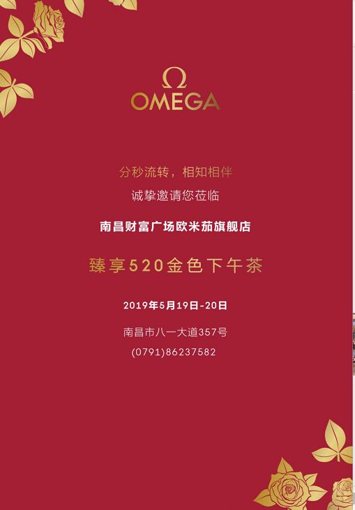 活动内容 【感恩回馈】活动期间部分表款低至3.5折起 【腕表保养】外观保养、洗油均享8折,PT牛皮表带7折、鳄鱼皮表带8折 【惊喜福利】活动期间品牌高端腕表鉴赏,并有丰富节目邀您共度精彩时光 【好礼不停】当天会员到店即享名表节定制会员礼一份 【神秘大奖】当天到店会员可参与抽取腕表大奖 5月19日-5月20日 欧米茄金色下午茶