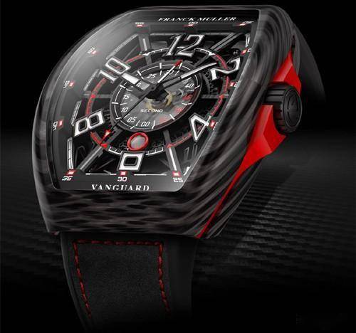 法穆兰推出Vanguard Racing 镂空系列腕表,该款腕表设计灵感源自赛车竞技,表盘也十分独特。该款Vanguard Racing镂空系列腕表具有小时、分钟、秒和日期显示。中央秒针计时器记录时间,秒针指示于底部从零开始,指针主体采用黑白双色设计、尖端为红色,以便从秒针的两端读取秒数。整体布局十分独特,机械感满满。