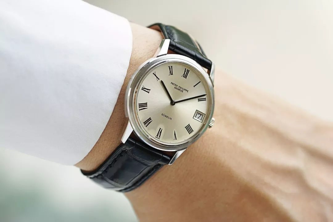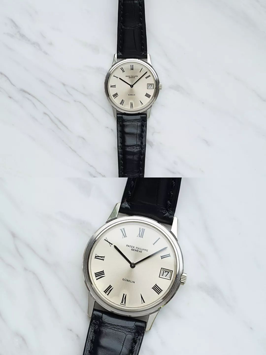 这是一枚珍贵的双签款百达翡丽男士白金自动腕表 / 型号3593 / 1977年瑞士生产 / 朴素典雅的圆形18K白金表壳直径34mm / 银色日辉纹两针表盘三点位置设置日历 / 黑色罗马数字时标与简洁干练的指针 / 六点位上方标记GUBELIN