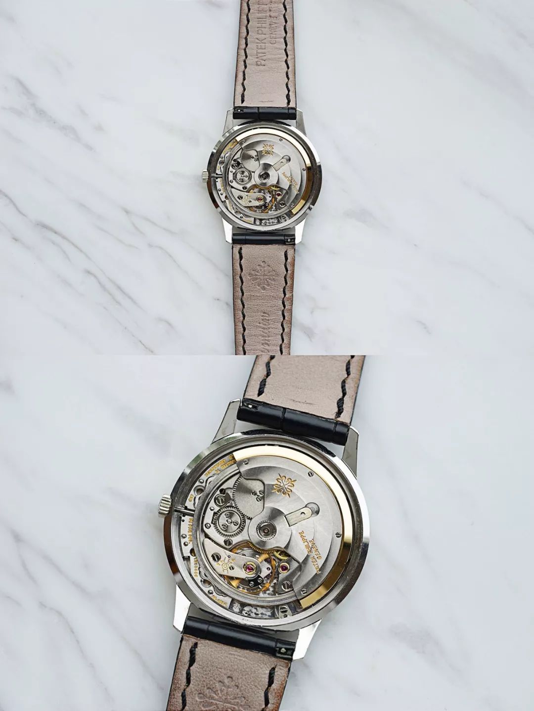内部装载精美的百达翡丽28-255自动上链机芯 / 双日内瓦印记 / 具备5种不同方位与温差调教 / 这枚自动机芯厚度仅为2.45mm / 21K金摆陀固定在铍质金属圆环上 / 下方设置红宝石滚珠帮助摆陀在轨道上顺畅摆动 / 是那个年代的巅峰之作