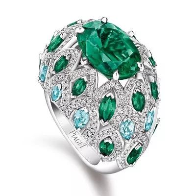 Titanota 白金戒指,by Piaget 主石为一颗5.03ct的椭圆形切割祖母绿,产自赞比亚,点缀榄尖形切割祖母绿,榄尖形切割帕拉伊巴碧玺,和圆形明亮式切割钻石。