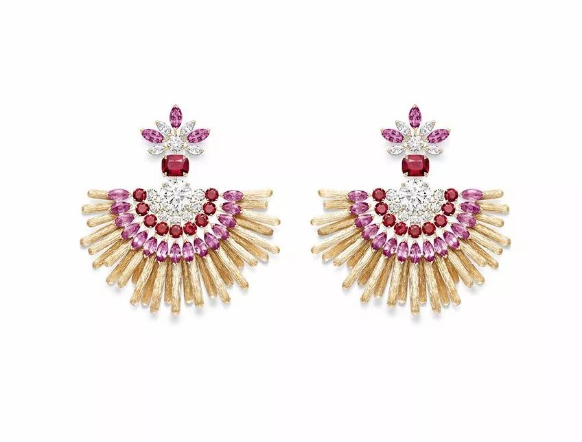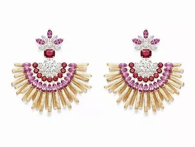 Desert Sunbow 玫瑰金耳坠,by Piaget 镶嵌2颗1.20ct的圆形明亮式切割钻石,2颗1.30ct的枕形切割红色尖晶石,点缀圆形切割红宝石,榄尖形切割粉色蓝宝石,榄尖形切割和与圆形明亮式切割钻石。