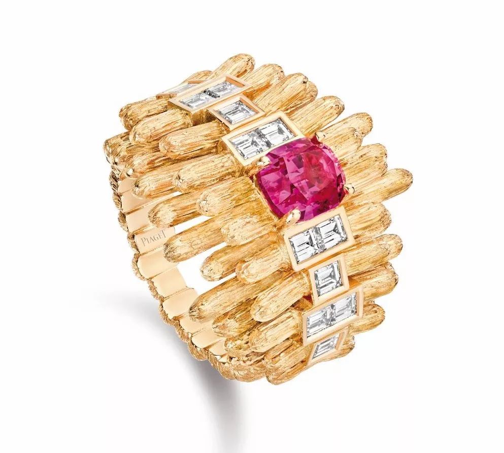Sun Gleam 玫瑰金戒指,by Piaget 主石为一颗1.72ct的枕形切割粉色尖晶石,点缀长阶梯形切割钻石。