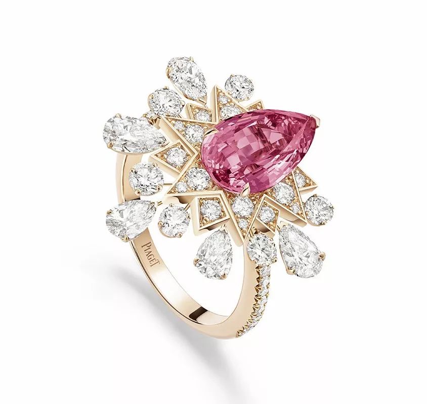 Hypnotic Lights 玫瑰金戒指,by Piaget 主石为一颗2.68ct的水滴形切割粉色尖晶石,点缀水滴形和圆形明亮式切割钻石。