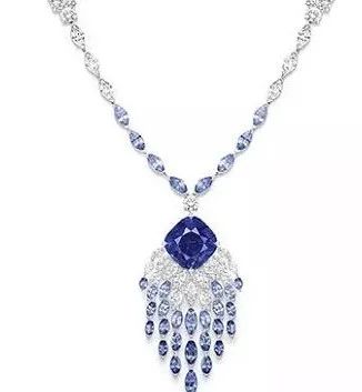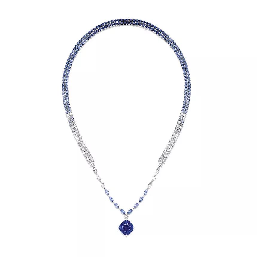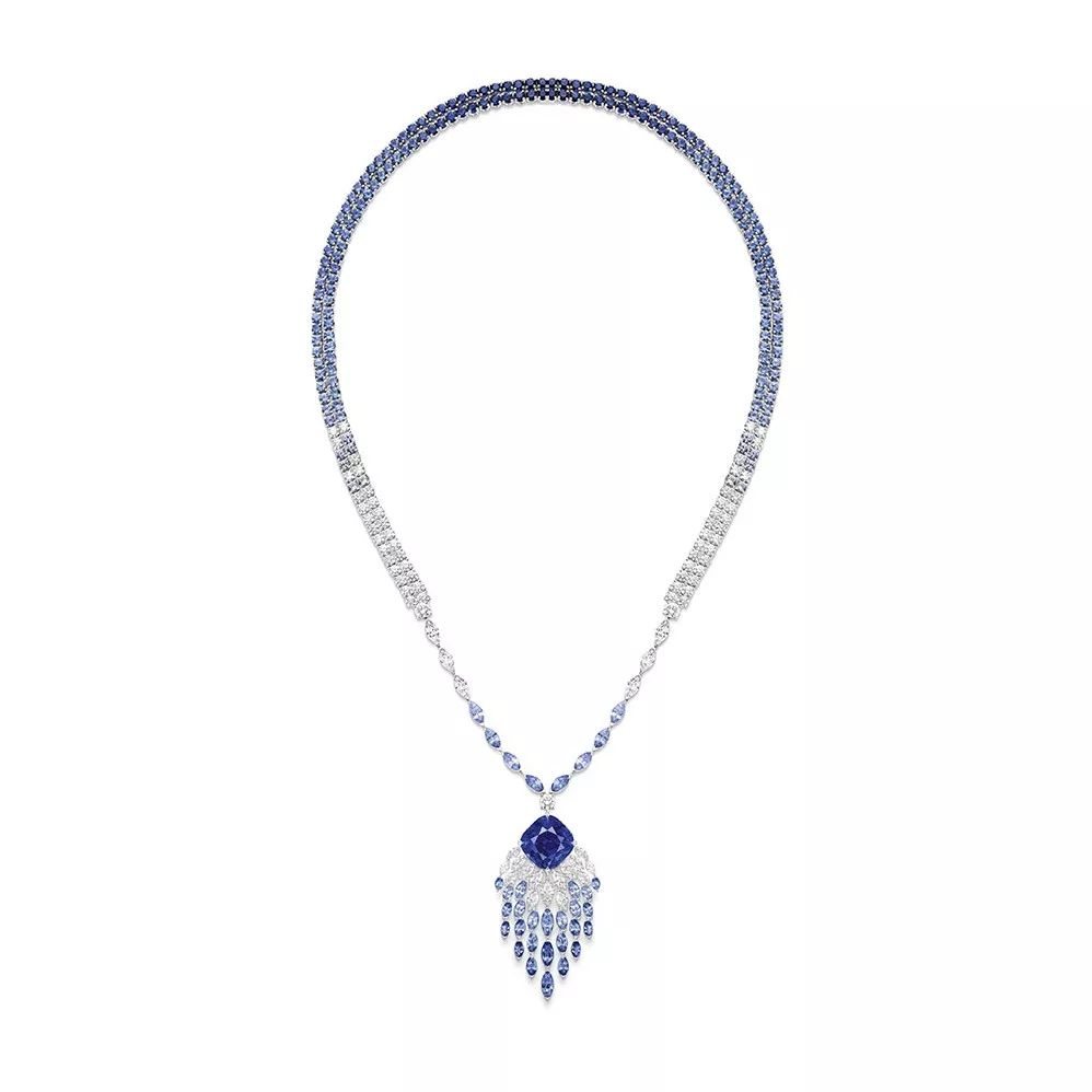 Blue Waterfall 白金项链,by Piaget 主石为一颗14.61ct的枕形切割蓝宝石,产自马达加斯加,点缀榄尖形和圆形切割蓝宝石,榄尖形和圆形切割钻石,可转换为未加流苏款项链。