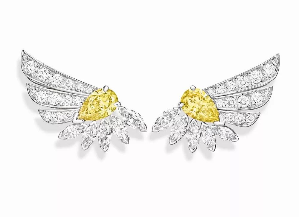 Shimmering Sun 白金耳钉,by Piaget 镶嵌2颗0.80ct和0.75ct的水滴形切割黄钻,点缀榄尖形和圆形明亮式切割钻石。