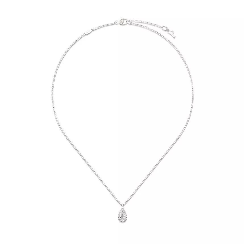 「Desert Minerals」以蓝色为主色调,重塑旷漠之中涌动的水流。Diamond Veil 戒指以一颗13.15ct的椭圆形蓝宝石为主石,让人联想到澄澈的湖水;Blue Waterfall 项链下方垂落着钻石与蓝宝石连缀的流苏,如瀑布一般倾斜而下,流苏亦可轻松拆下,转换为更简洁的设计版本。 Shimmering Sun 白金项链,by Piaget 镶嵌一颗3.57ct的水滴形切割黄钻,点缀长阶梯形切割、榄尖形切割、圆形明亮式切割钻石。