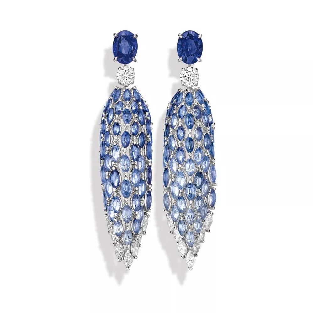 Blue Waterfall 白金耳坠,by Piaget 镶嵌2颗3.13ct和3.01ct的椭圆形切割蓝宝石,产自斯里兰卡,2颗1.00ct的圆形明亮式切割钻石,点缀榄尖形切割钻石和蓝宝石,可转换为单颗蓝宝石耳坠佩戴。