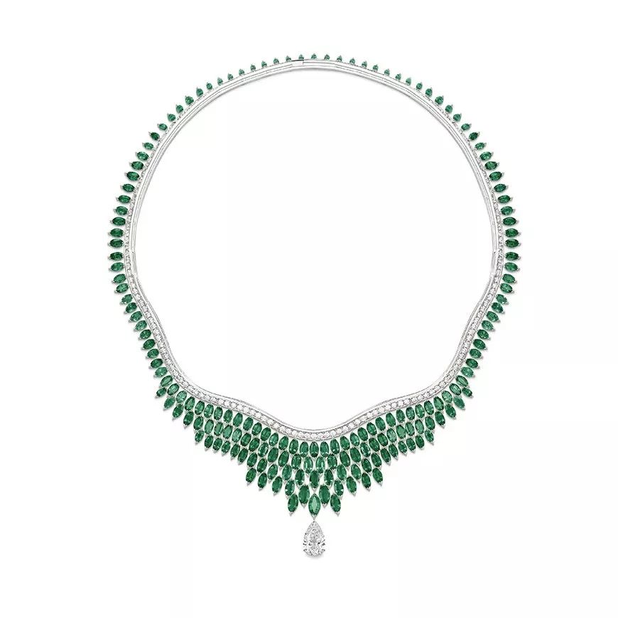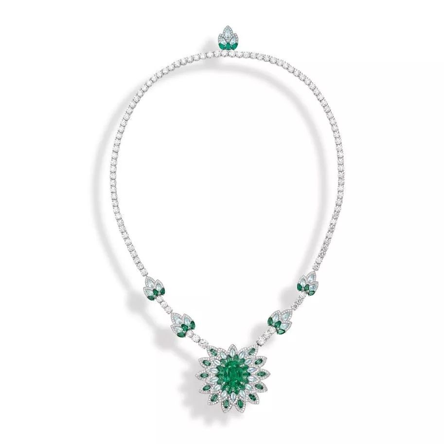 Luxuriant Oasis 铂金项链,by Piaget 镶嵌一颗3.01ct的水滴形切割钻石,点缀榄尖形切割祖母绿和圆形明亮式切割钻石,可转换为单钻项链。