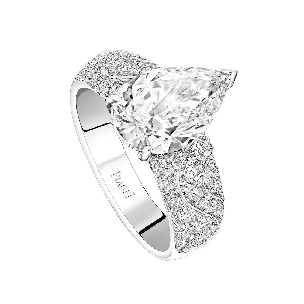 Mirage 白金戒指,by Piaget 主石为一颗3.02ct的水滴形切割钻石,点缀圆形明亮式切割钻石。