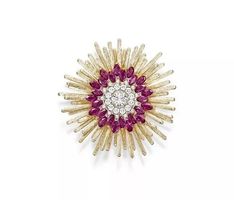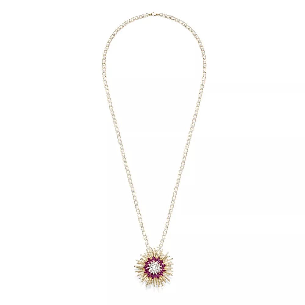 Desert Sunbow 玫瑰金项链,by Piaget 镶嵌一颗1.52ct的圆形明亮式切割钻石,点缀榄尖形红宝石和圆形明亮式切割钻石,可转换为胸针佩戴。