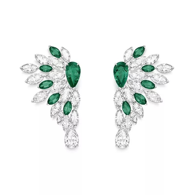 Vegetal Laces 白金耳坠,by Piaget 镶嵌2颗1.26ct和1.14ct的水滴形切割祖母绿,点缀榄尖形切割祖母绿,水滴形和榄尖形切割钻石。
