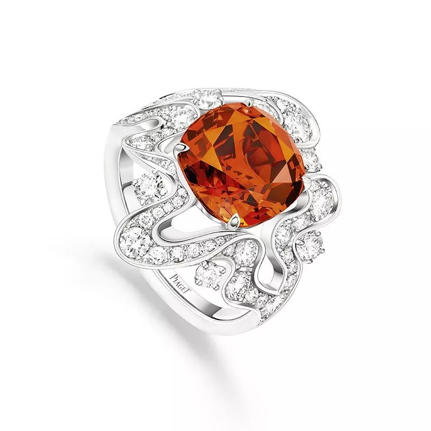 Irresistible Attraction 白金戒指,by Piaget 主石为一颗7.61ct的枕形切割锰铝榴石,点缀圆形明亮式切割钻石。