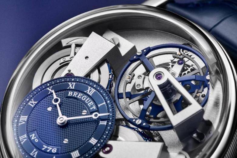 芝麻链陀飞轮传动装置点缀尊贵宝玑蓝。为呈现和谐一致的视觉效果,所有部件均采用了不同的处理方式。陀飞轮笼架和表盘覆以蓝色涂层,蓝色链节则采用蓝钢烧制工艺。全新表款沿袭今年5月推出的Tradition传世系列7597日期逆跳腕表的美学设计,巧妙演绎宝玑蓝与深灰色的优雅对比。 该腕表搭载的芝麻链陀飞轮传动装置确保了无论主发条的上链程度如何,机芯总能保持恒定的力矩输出,从而优化腕表的运行稳定性。 当主发条完全上链时,会释放最大的动力。此时,芝麻链作用于塔轮上方圆周较小的部分。随着发条逐渐松弛,动力也逐渐减小,芝麻链此时作用于塔轮圆周较大的部分。如此,便可在钟表运行的过程中确保恒定的动力输出。 全新7047芝麻链陀飞轮腕表呈现现代化风格,同时沿用品牌经典设计元素,金质偏心表盘饰有巴黎鞋钉纹(Clous de Paris)玑镂刻花图案,配备传统罗马数字时标及针尖带偏心镂空“月亮”的指针。表盘与其灵感之源相同,以三颗螺丝固定。