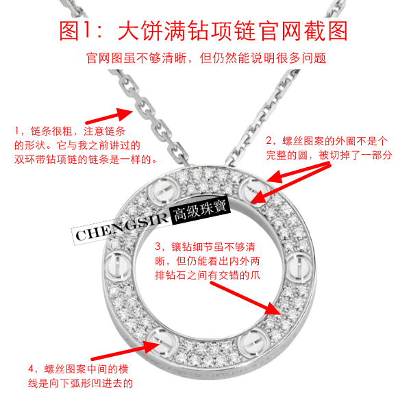 卡地亚love项链系列中最大的几款圆饼吊坠项链,常称为大圆饼或大饼项链。本子系列共有4款:无钻、3钻、6钻和满钻。今天就讲讲满钻款的鉴定。 我将用经手过的正品、GF以及超GD的各角度实拍以及官网图等进行对比讲解。文中重点讲难点,简单鉴定点直接放在图中,请结合图文阅读。 图1,先上款式官网截图,我选了最清楚的白金色,可惜仍不够清晰。