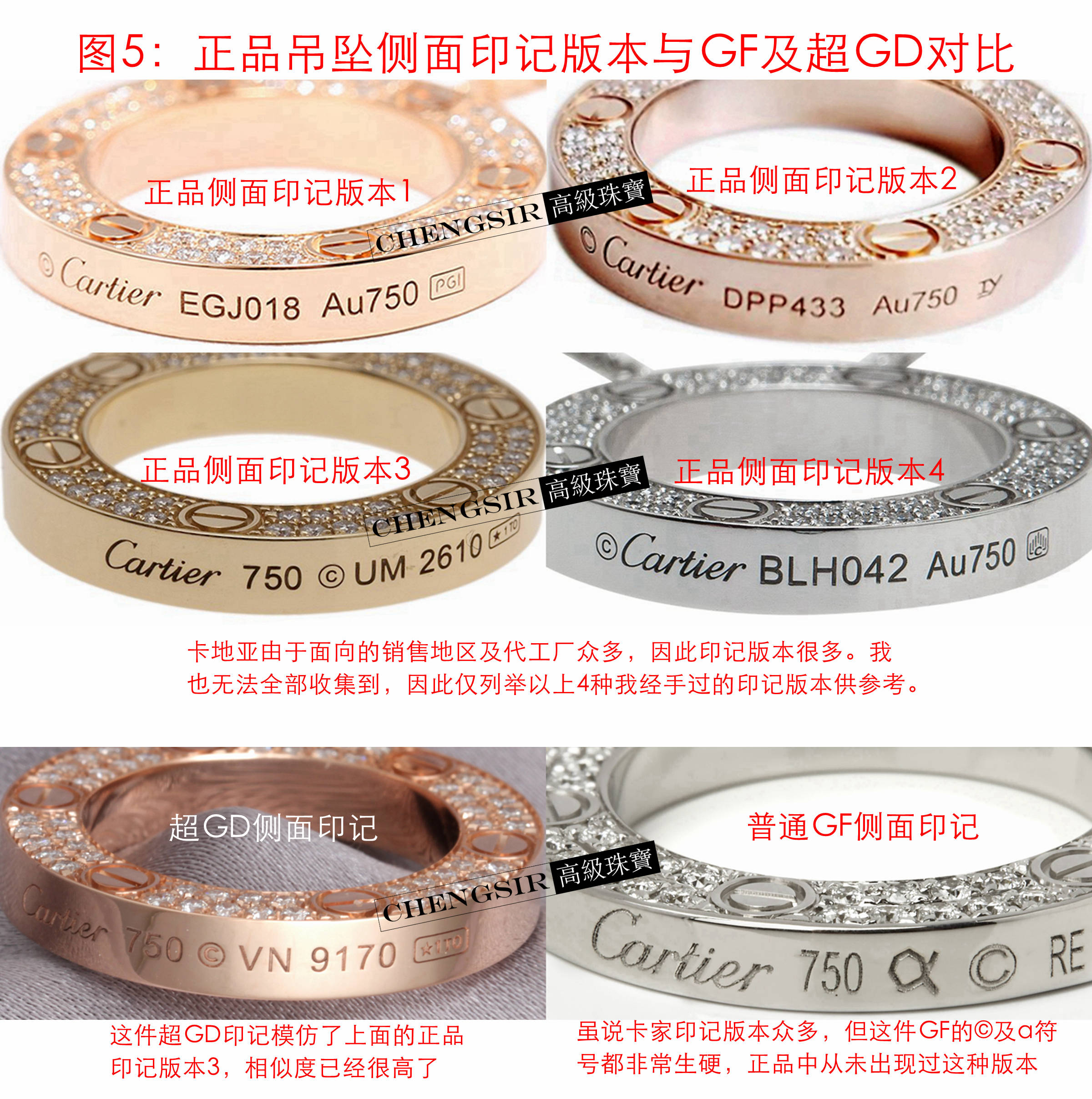 为何GF不使用原版CNC工艺呢?因为镶钻区域的爪实在太小,要用CNC工艺雕刻对设备、雕刻刀头的精细度要求极高,会导致成本急剧上升。再加上镶钻爪形状、大小繁多而复杂,需要高技能的3D绘图师、CNC程序员、CNC操机工程师等多工种联合协作,难度极大。绝大多数GF厂不具备这样的能力,故光此细节就能排除掉99%以上GF了。当然,就像我在其它笔记里讲的一样,市场上依旧有极少数超GD,鉴定难度极大,如果遇到建议向专业鉴定机构求助! 图4-6为其它部分细节的讲解,其中穿插了正品的不同版本的介绍。